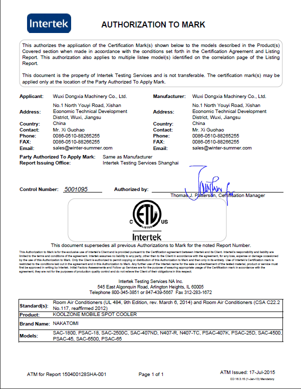 星空公司网站网页版入口-星空(中国)近日宣布公司移动式工业冷气机获得的质量与安全第三方机构天祥实验室(世界上规模的消费品测试、检验和认证公司之一)颁发的ETL认证。