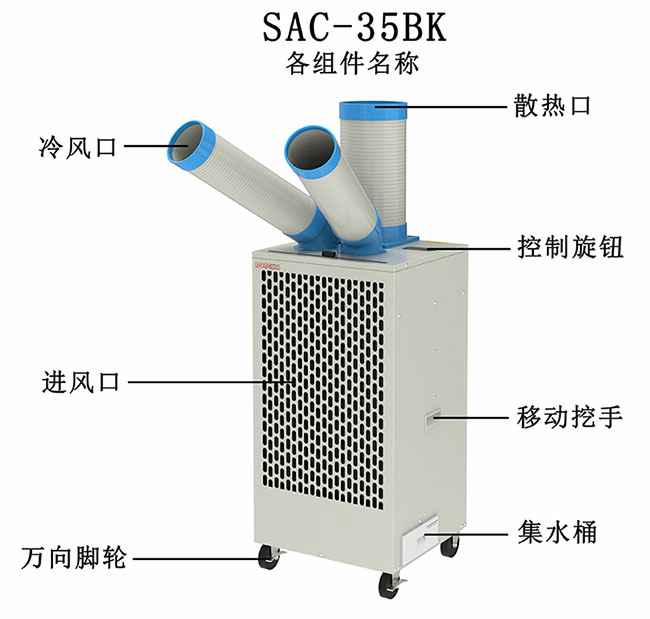 型号 SAC-35BK 电源 相220V/50Hz 单制冷量 3.5KW 制冷量 12000BTU 运转电流 5.1A 消耗电力 1.1KW 水箱容量 5L 风量 550m³/h 自动摆风 有 本体尺寸 W470 D450 H945(mm) 包装尺寸 W518 D498 H1010(mm) 毛重 64.5Kg 净重 57Kg 运行环境 25~45℃ - 01松下压缩机采用松下小型旋转式封闭压缩机与亲水铝箔换热器及内螺纹铜管,制冷速度更快,效率更高,更加节能静音。02独特排水设计抽拉式的水箱设计,集水、倒水更方便,也可以选择外接排水管。03防水设计独特的防尘控制面板,能减少车间粉尘及异物对机器的危害。04一体式设计一体式设计,标准插头,无需安装,通电即用,方便快捷。05全铝制风叶采用全铝制离心风叶,风量更强更均匀。06全铜马达采用全铜质马达,寿命更长,噪音更低。07热风口外接热风口可以另购排热管道接到室外,减少对室内环境的危害。08防尘滤网配备过滤网,减少粉尘油腻对机器的侵袭。0975°自动摆风出风口可75°自动摆风,适用于3-5个岗位的降温。10冷热气流分离设计冷热气流分离技术,减少冷量的损失,避免热风的侵袭,大大提高了机器效能。11冷风管的随意摆动和精准定位冷风管可任意弯曲,大角度旋转。12万向轮设计机器采用了万向轮设计,方便移动到任意空间角落进行使用。